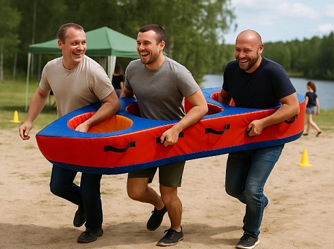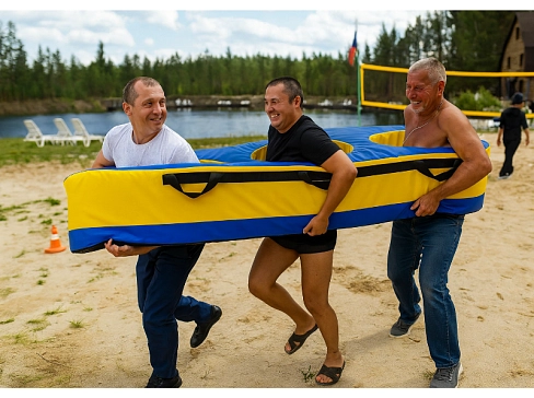 Комплект для командной игры «Передвижной мост, переправа» – надувное игровое оборудование для тимбилдинга, спортивного мероприятия, детского праздника. Задача игроков – максимально быстро создать «мост» для прохода участника команды. Правила вариативны и зависят от уровня спортивной подготовки участников. Элементы могут располагаться на полу, но особенно интересно, когда они размещаются на спинах играющих – для этого у каждого «плотика» есть специальные ремни. В игре в форме эстафеты принимают участие 2 команды.