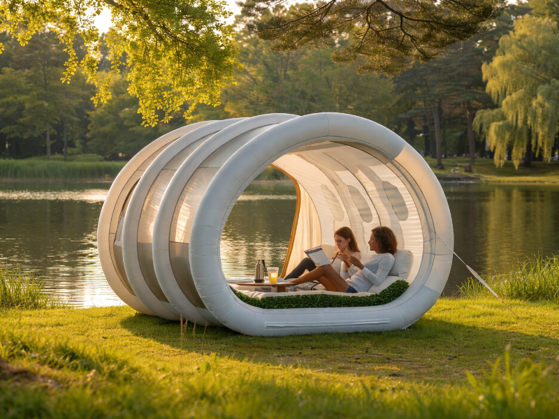 Надувной купол защищает от ветра, насекомых и легких осадков, создавая внутри комфортный микроклимат. Прозрачные элементы обеспечивают естественное освещение и позволяют наслаждаться окружающими пейзажами.