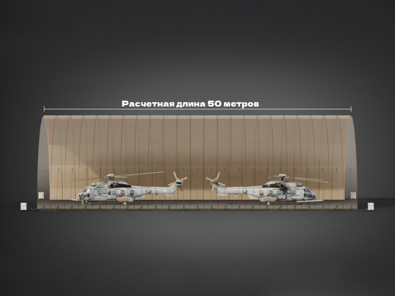 На представленных рендерах показан ангар размером 26 × 50 метров — этого достаточно для одновременного размещения двух вертолетов или двух самолетов типа истребитель. При этом габариты конструкции могут быть изготовлены в любом необходимом размере под конкретные задачи заказчика.